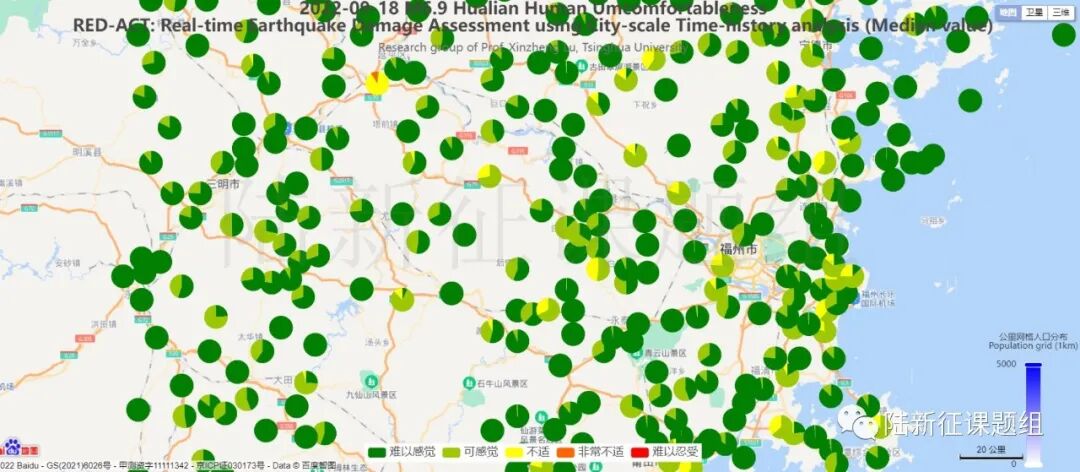 因此,我们就可以进一步利用各个台站的记录,以及城市抗震弹塑性分析给出结果,得到不同地区人员感受到的加速度(这里已经考虑了建筑引起的加速度放大效应),进而给出人群的感受比率,如图2所示。其中,人员感受与加速度的对应关系如表1所示(董安正, 赵国藩. 高层建筑结构舒适度可靠性分析[J]. 大连理工大学学报, 2002, 42(4):472-476)。
