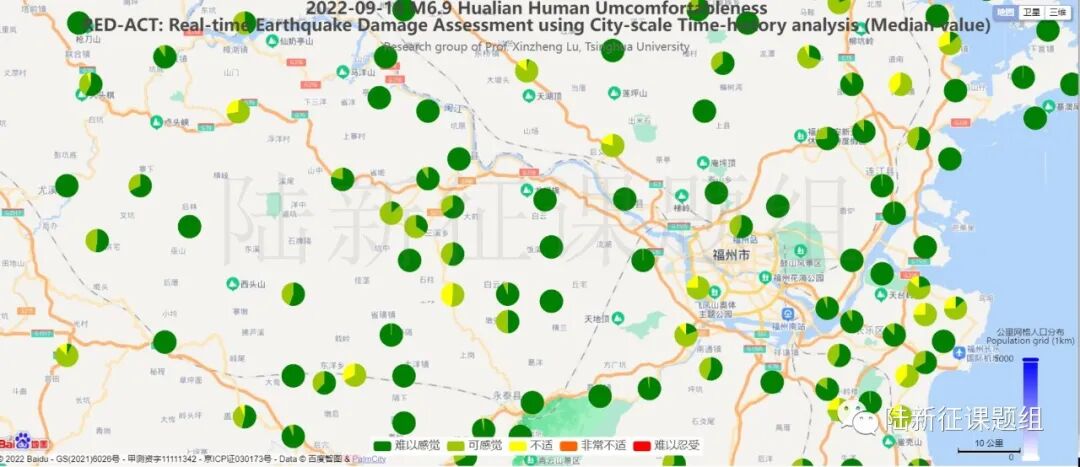 从图2可以清晰看出,虽然本次地震不会在大陆地区引起什么破坏,但是地面加速度造成的人员不适的比例较高。在福州等地,感到“不适”的比例可以接近50%。所以当地民众感觉震感强烈是完全合情合理的。本案例也进一步说明了城市抗震弹塑性分析的优点。