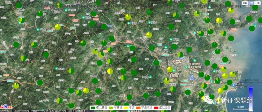 (深绿色代表“难以感觉”、淡绿色代表“可感觉”、黄色代表“不适”、橙色代表“非常不适”、红色代表“难以忍受”)
