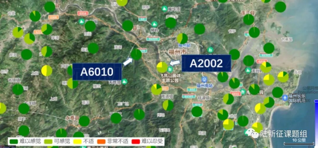 图3所示为福州市区附近的不同台站地震加速度人员感受分布图。可以看到在非常临近的区域里面,人员加速度感受会有很明显的差异,而且规律也比较复杂,不是简单的随着距震中距离增加而单调下降。