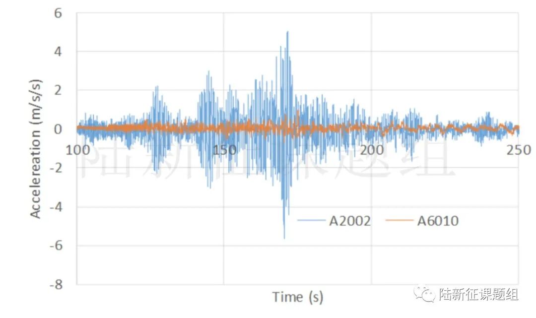 图8 A2002台站和A6010台站地震动记录对比(EW分量,纵坐标单位为gal)