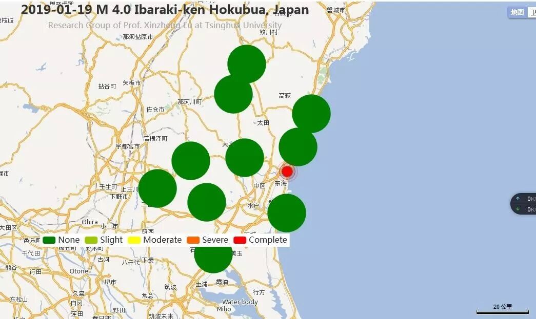 1月18日,在日本东京东侧发生了一场5.0级地震,震源深度47.9km;次日(1月19日),在东京东北角,又发生了一场4.0级地震,震源深度60km。由于日本是一个多地震国家,抗震工作做得比较好,所以两次地震都没有造成什么结构破坏,我们的城市抗震弹塑性分析程序,基于日本K-Net网络获取的实测地震动,在震后第一时间给出的分析结果如图1、图2所示。