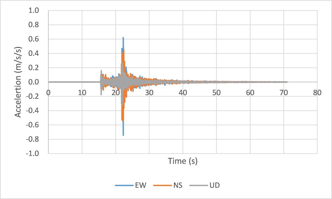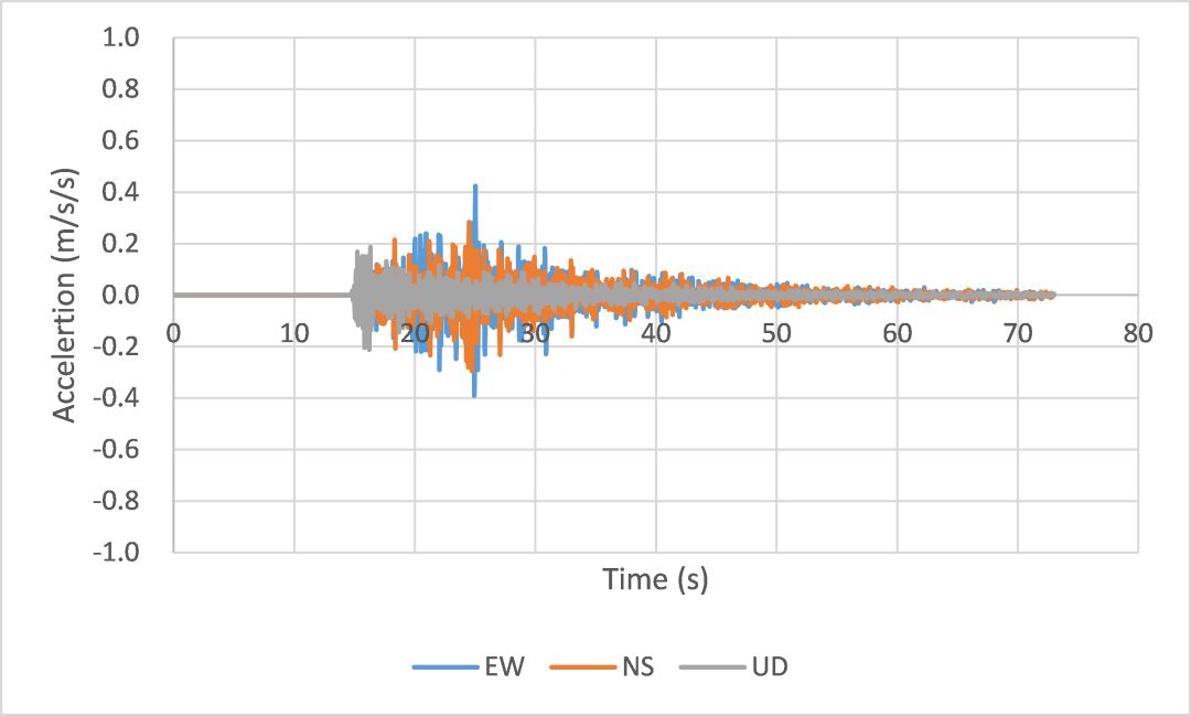 图3 1月18日5.0级地震记录的PGA最大地面运动(IBR013台站,PGA=0.42 m/s/s)