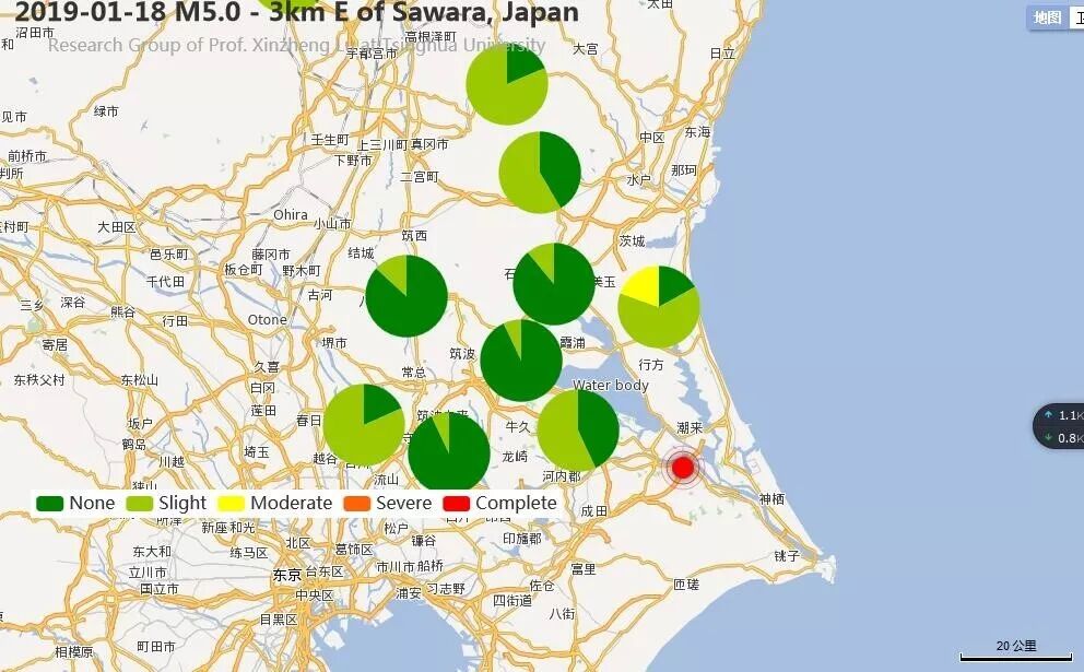 图2 1月19日4.0级地震引起的建筑破坏预测结果(采用日本建筑模型)