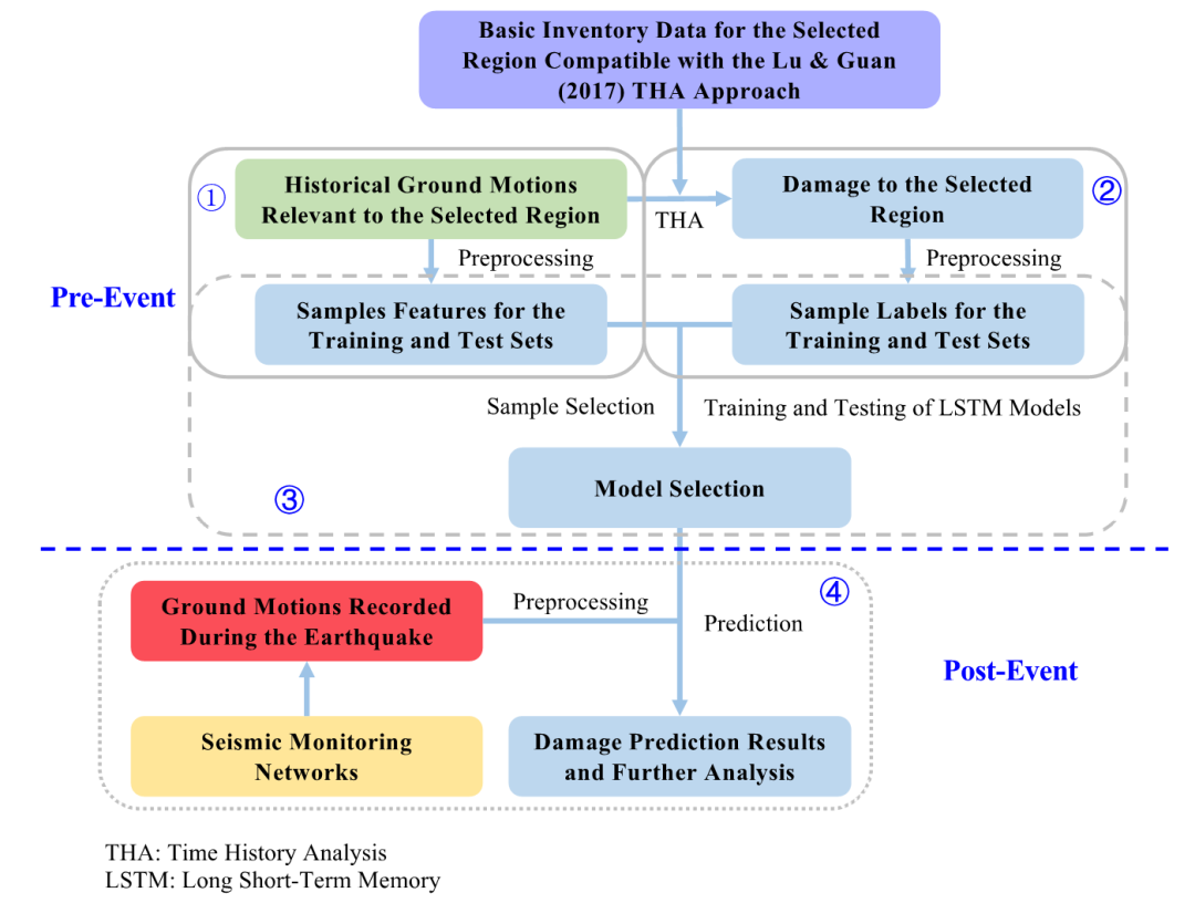 本研究提出了一种基于长短时记忆神经网络(Long-short Term Memory Neural Network, LSTM)的应急震害预测方法。该方法基于大量历史地震动和准确的非线性时程分析方法获取的破坏力结果,学习地面运动加速度时程与地震动破坏力的映射关系,保障准确性;此外,该方法实现了“震前训练验证、震后应急预测”两步走,将耗时较长的训练、验证环节前置,保障实时性。