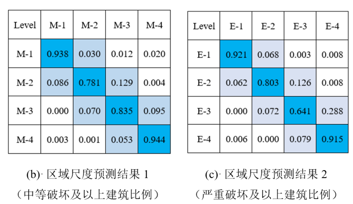 测试集上的预测结果(以混淆矩阵的形式表示)如图4所示。可以看出,无论是单体还是区域尺度,本文方法都具有较高的准确性(单体尺度上:平均准确率78.6%,误差±1等级以内的预测结果占比98.1%;区域尺度,大部分破坏力等级的预测准确率超过80%,误差±1等级以内的预测结果占比均超过96%)。