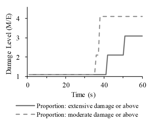 由于本方法实时性好,因此可以随着地震动信号的接收,以较短的时间间隔(例如1秒)持续开展评估,并不断更新地震动破坏力评估结果(如图6所示)。可以看出:地震动破坏力评估结果快速上升的区段,和地震动时程中的主要区段相吻合;中等破坏及以上建筑比例始终高于严重破坏及以上建筑比例,符合结构破坏的基本规律;且最终两项预测结果均稳定在正确等级上(60s后预测结果没有再改变)。上述结论再次证明了本文所提出的预测方法的可靠性。