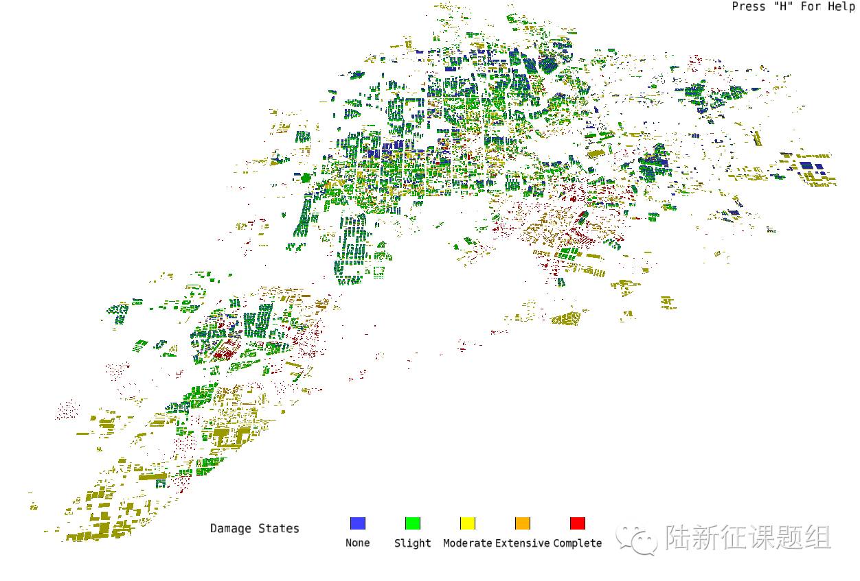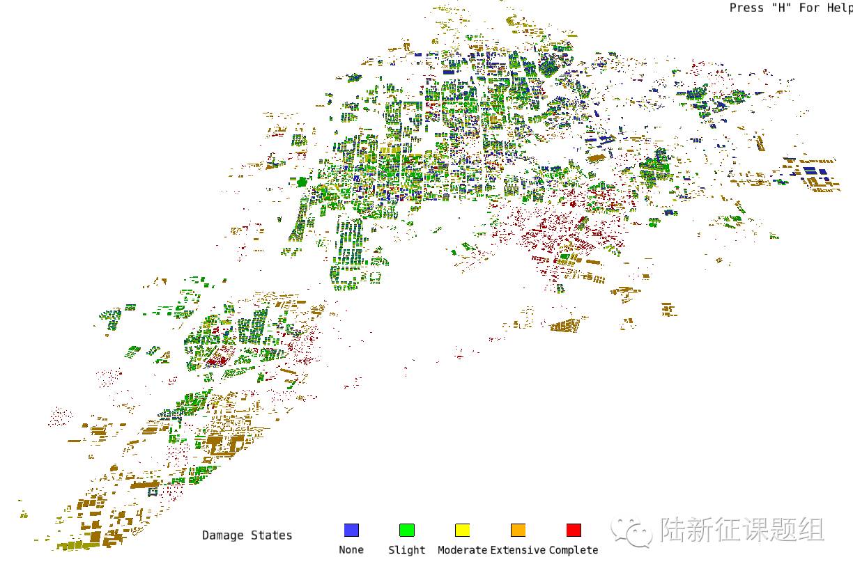 唐山市23万栋建筑的震害分布如图2.1、图2.2所示。地震响应动画如视频所示。