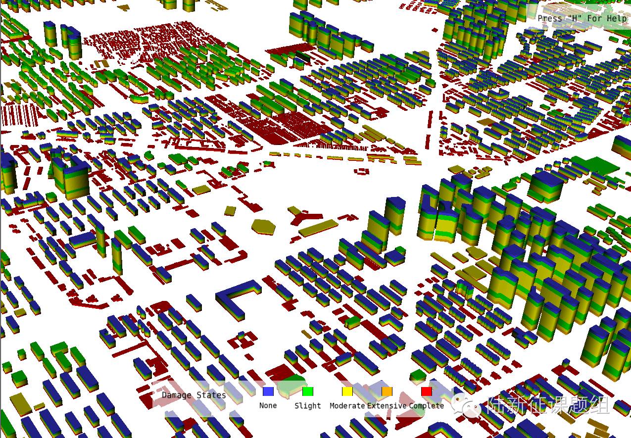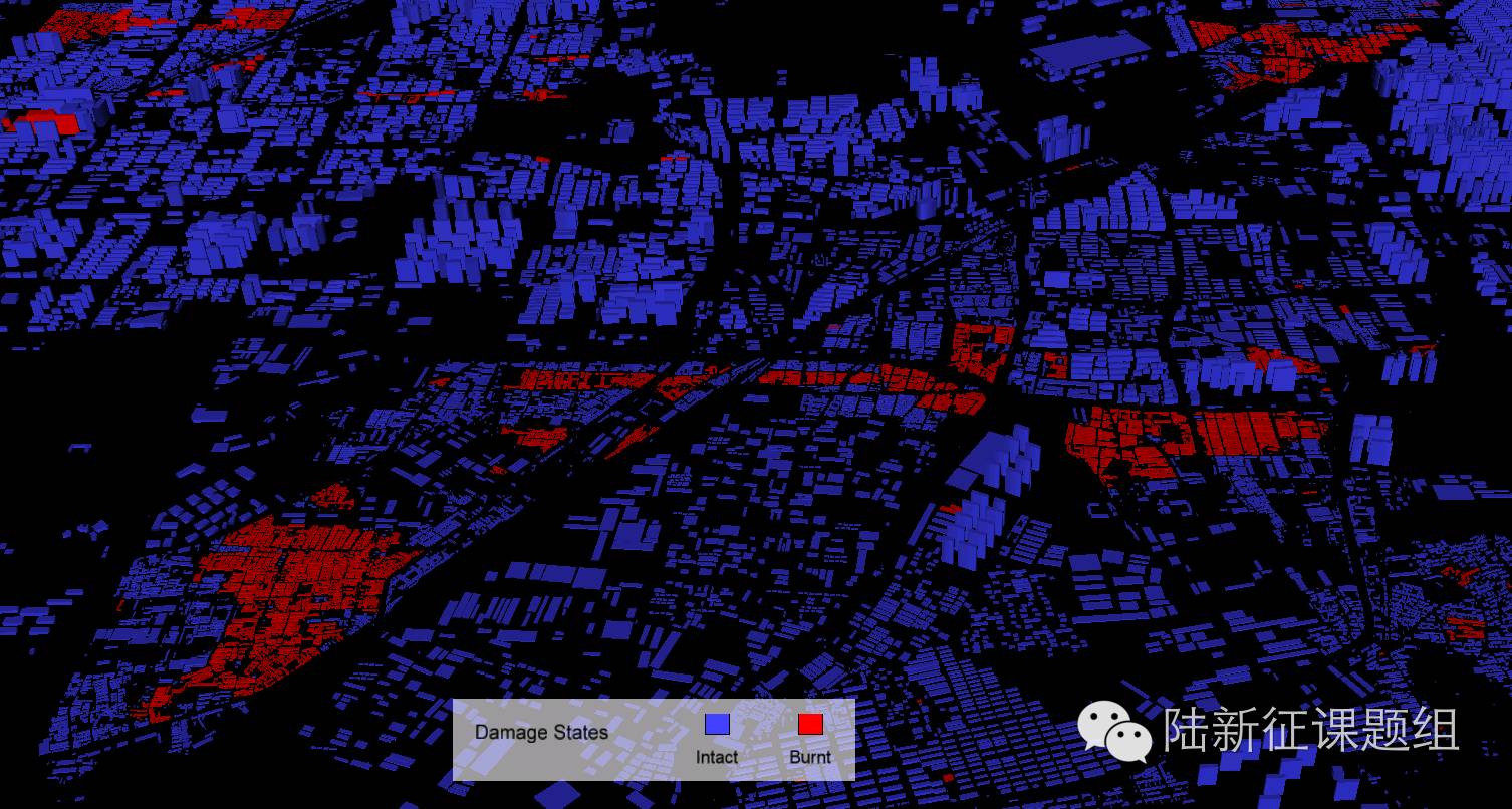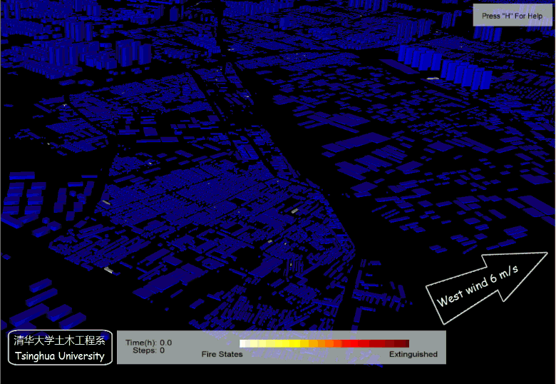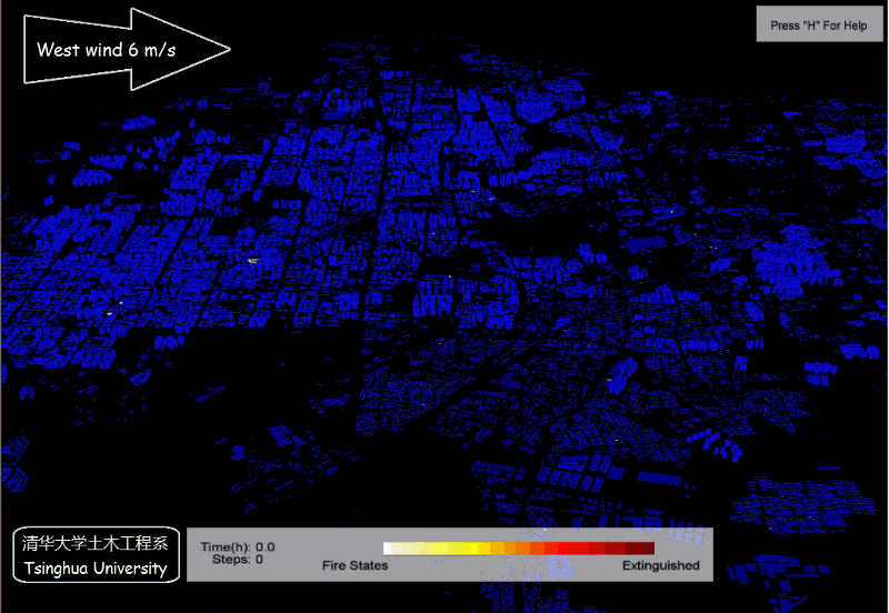 课题组基于任爱珠教授、赵思健等的工作,编写了地震次生火灾模拟程序。程序采用回归模型计算起火建筑数量,采用火灾蔓延物理模型模拟火灾蔓延的两个重要因素,即热辐射、热羽流,考虑了风向、风速、结构类型、震害程度等的影响。主要参考文献如下: