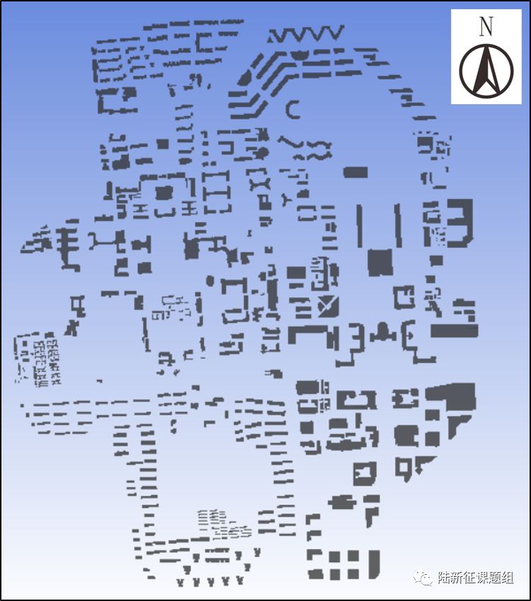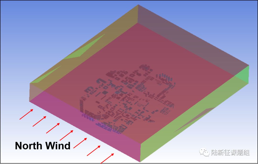 分析对象为整个清华校园,清华校园建筑群占地面积为1.855km×2.255km,最高建筑高度为78m,平面图如图1所示。CFD计算域为3.104km×3.621km×0.580km,其中上游长度0.352km,下游长度1.014km,建筑边界距计算域两侧边界均为0.624km,满足COST 732和AIJ对区域CFD模拟的相关要求。计算域示意图如图2所示。