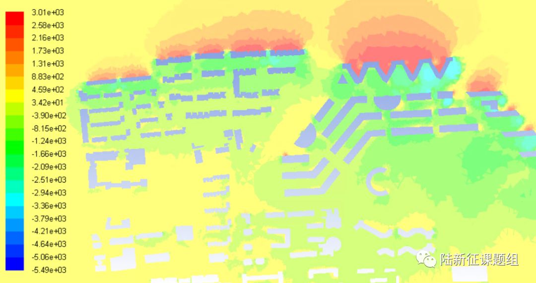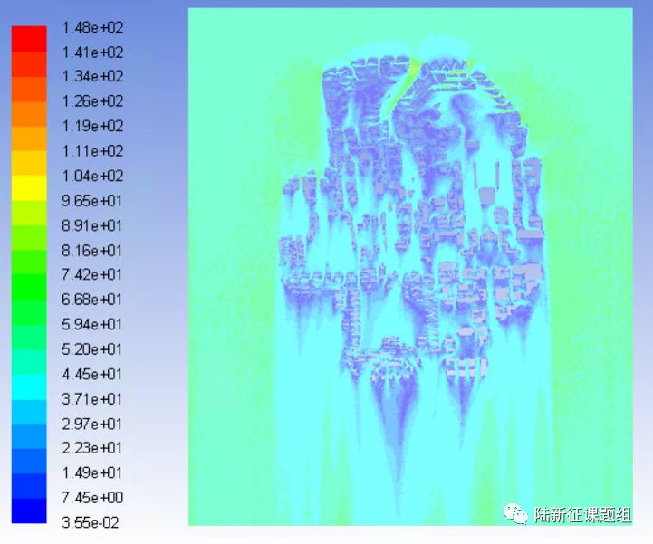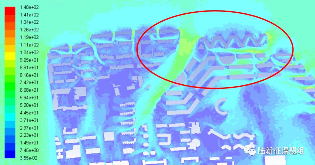 清华校园高度1.5m剖面的平均风速分布如图4所示。总体来看,校园大部分区域平均风速在40m/s左右,建筑后方小块区域的平均风速可以降到20m/s左右,但仍然严重影响人类活动。但是由于建筑物形成的“风道”效应,部分区域局部平均风速(如校园最北面的紫荆学生公寓附近)会有显著增加,如图5所示。
