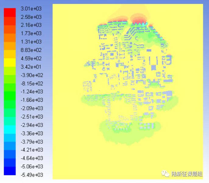 湍流模型采用Reynold Stress 7方程模型(RSM),如果想获取更加准确的模拟结果,可以采用大涡模拟(LES),但由于LES计算量大、耗时长,此次分析没有采用。计算域边界条件为:入口为速度边界,出口为自由流出边界,顶部和两侧均为对称边界,底部以及建筑表面为墙边界,采用Standard Wall Law。