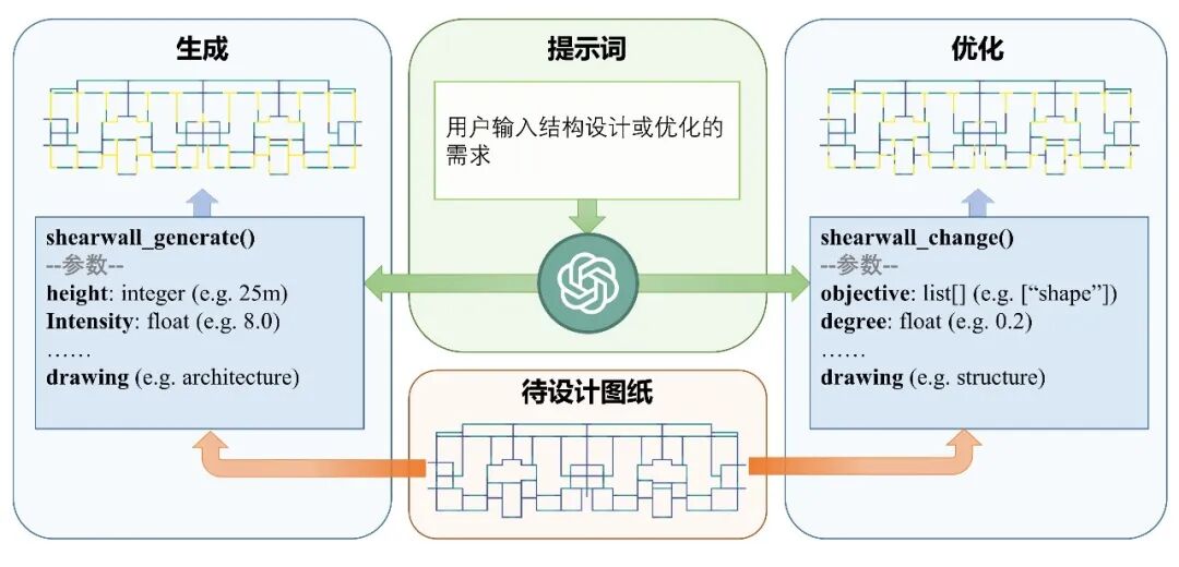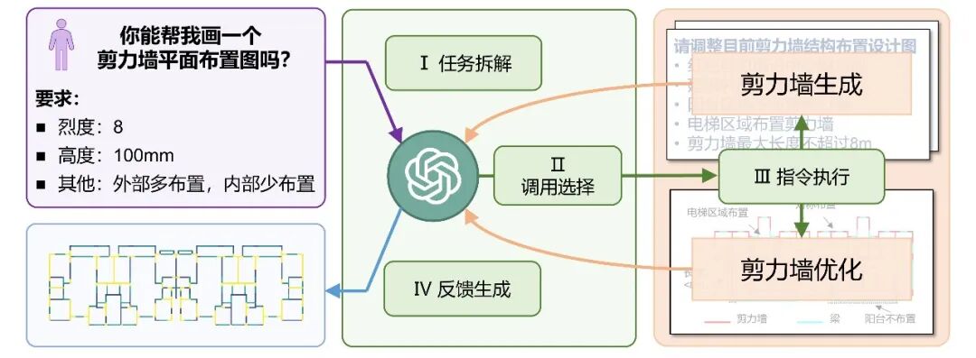 我们课题组近4、5年来一直在思考:大语言模型在结构设计中能发挥怎样的作用。在结构设计过程中,工程师往往需要先设计一个初始布置,再通过反复的调整找到一个最优结果,整个过程复杂繁琐且依赖于设计经验,而大语言模型恰好可以作为一个代理工程师,帮我们自动完成整个任务。