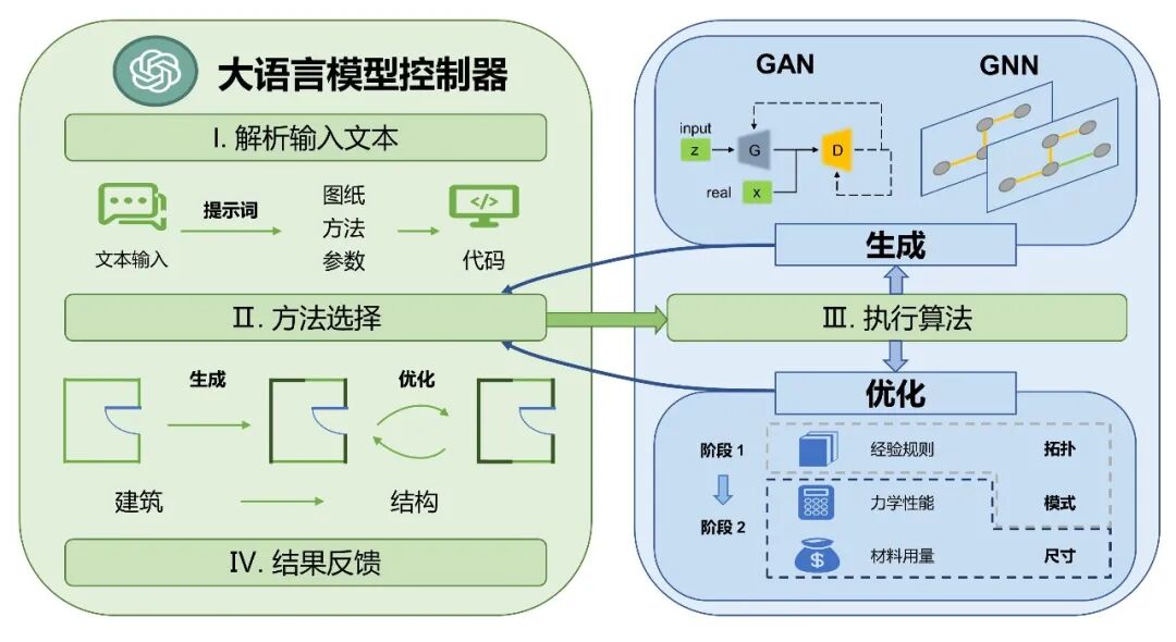 在系统核心的控制层中首先解析输入的设计需求文本,规划后续需要执行的任务并提供相关参数,之后根据解析结果选择相应的算法,包括结构生成和结构优化两大类,然后输入待设计图纸,执行算法,返回生成结果。通过用户和控制器的多轮迭代交互,即可不断优化设计的结果,最终得到符合要求的结构设计方案。