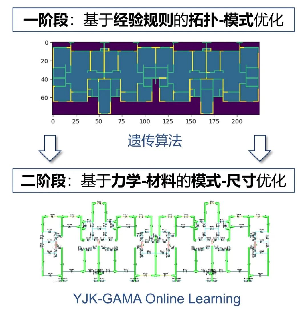 我们在优化阶段延续拓扑-模式-尺寸三层次优化(详见:拓扑-模式-尺寸三层次的优化改进AI结构设计 | 新论文:基于规则学习与编码的剪力墙智能设计优化)的思路,提出了一种两阶段优化方法,首先基于结构设计经验与规范中的要求,采用遗传算法实现拓扑和模式层面的优化,初步确定结构布置的形式,再基于具体的力学和材料用量计算,通过YJK-GAMA的Online learning算法实现模式的调整和构件尺寸的优化。