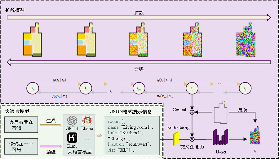 ChatHouseDiffusion方法如图所示,主要可以分为两个部分:(1)基于大语言模型对自然语言房间设计条件的理解与解析;(2)基于扩散模型进行建筑平面图的条件生成与编辑。