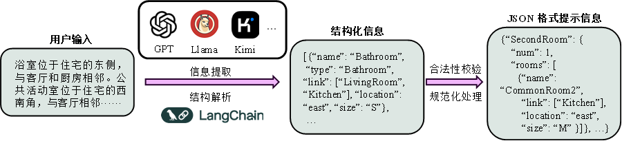 用户只需输入一句话需求,系统就会调用大语言模型,将其转化为JSON格式的结构化信息,清晰记录房间位置、大小和连接关系。