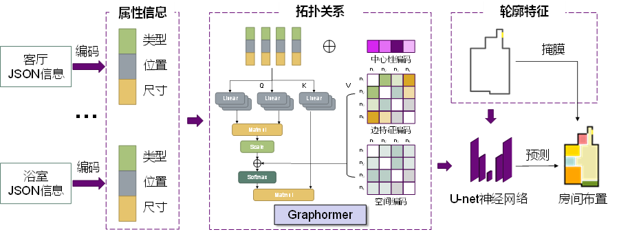 为了理解房间之间的拓扑关系,本研究引入了Graphormer来捕捉房间之间的拓扑关系,并将其编码后作为设计条件输入扩散模型,在房间外轮廓约束下,扩散模型负责一步步“去噪”,逐渐生成符合需求的平面图。它不仅能保证整体布局合理,还能使细节呈现更为自然逼真