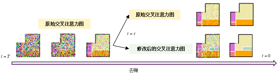 在ChatHouseDiffusion中,平面图是通过扩散模型一步步“去噪”生成的,过程里依赖交叉注意力图来确定“卧室”“厨房”等词对应的区域。如果采用传统方法,一旦修改条件(如把卧室挪到北边),就会导致整张图重画,其他房间也被打乱。因此ChatHouseDiffusion在生成时保存注意力图,编辑时在初始去噪阶段沿用原始注意力图,随后再启用修改后的注意力图,从而保证整体布局不受影响。