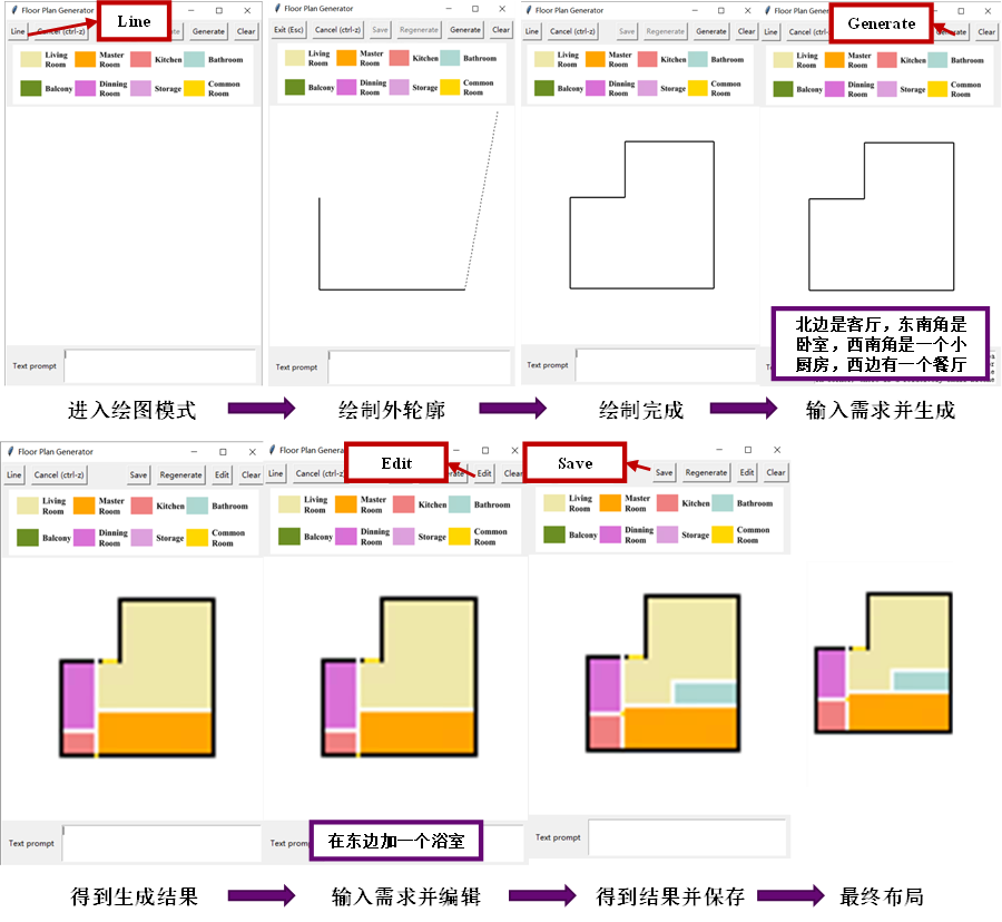我们基于ChatHouseDiffusion搭建了一个开源平台,用户只需手绘外轮廓并输入简单的文字需求,系统就能快速生成建筑平面图,并支持后续的交互式编辑。平台集成了绘图、文本输入、自动生成与局部修改等功能,操作直观,轻松易用。相关代码可参考GitHub仓库:https://github.com/ChatHouseDiffusion/chathousediffusion