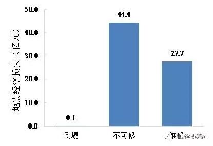 建筑震后修复的代价是非常高的,特别是我国建筑多采用混凝土结构或砌体结构,其变形能力差,修复难度大。本文作者对北京市清华大学校区的619栋建筑进行了分析[6]。研究结果表明,在遭受中震作用后,地震损失高达72.3亿元。其中60%以上的损失是因为部分建筑震后的残余变形太大,以至于修复成本太高,拆除重建反而比维修更经济(图2)。也就是说,按照现行的抗震规范设计的建筑,有相当比例的建筑在中震后即使技术上是可以修复的,经济上也是不经济的。而重建这些建筑物造成的经济成本和社会冲击也显然超出了地震韧性城市的要求。