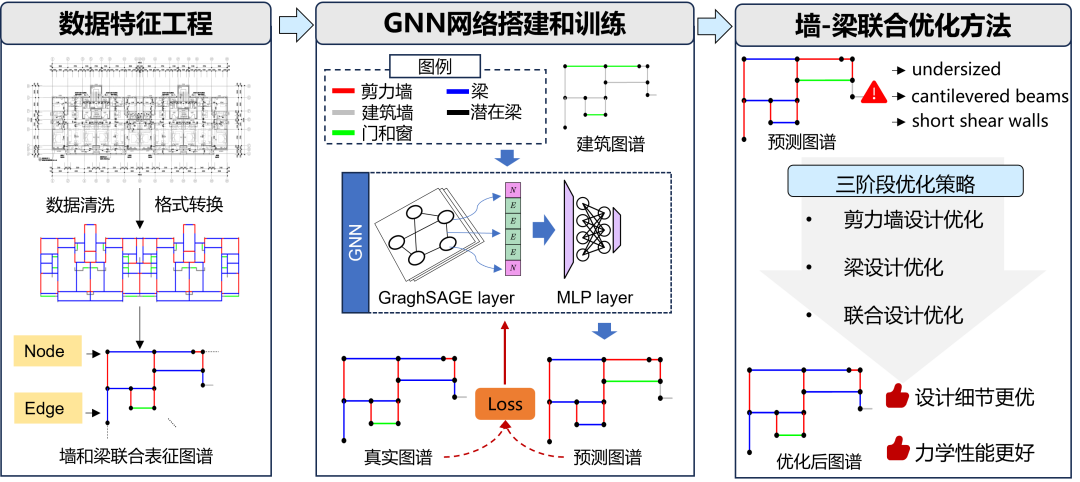 本研究提出的基于图神经网络(GNN)的剪力墙与梁协同设计方法,通过耦合墙-梁布置的Graph表示和Graph-SAGE算法,联合生成结构布局,结合规则编码优化策略,显著提升剪力墙和梁的设计质量,欢迎各位专家批评指正!