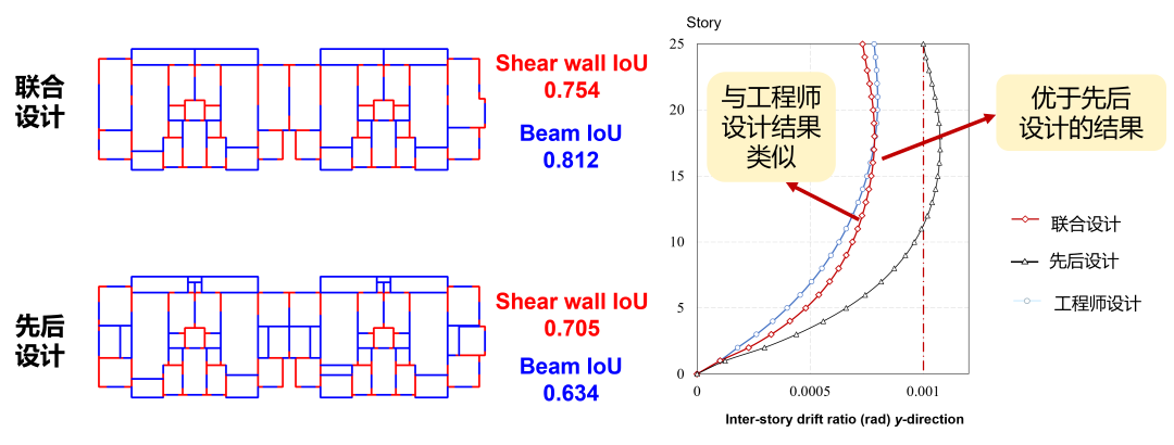 (1)协同设计提升性能:AI联合设计相比GNN先后设计的剪力墙和梁在多个力学指标上占优。