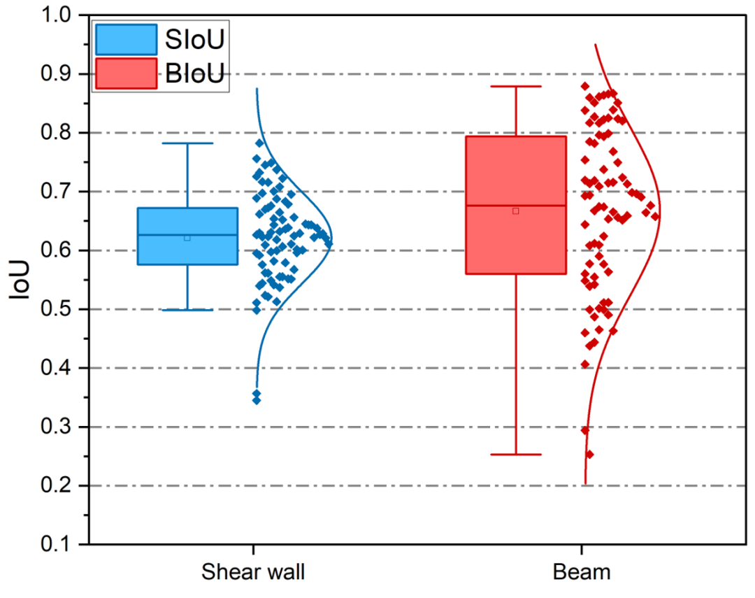 下图展示了在多个案例中,基于墙-梁联合生成算法生成的剪力墙和梁IoU计算统计图。统计案例的平均值大于0.5,表明联合生成的构件布置接近工程师设计水平。