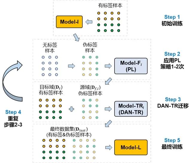 基于DAN-TR网络和伪标签(PL)策略,本研究提出了迭代自迁移训练方法,如下图所示,包含5个关键步骤: