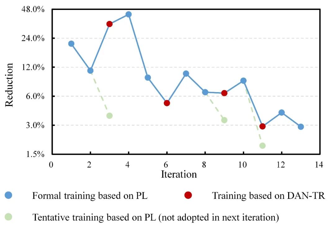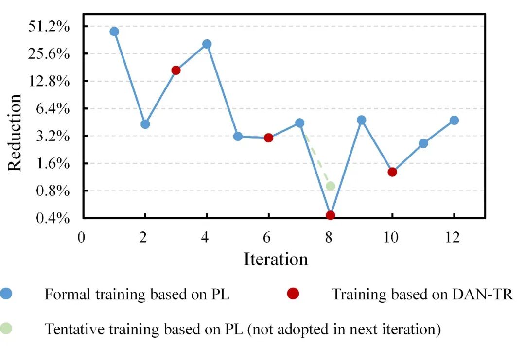 (3)在采用伪标签策略1-2轮次后,基于DAN-TR网络开展迁移(图中红色样本点),不仅可以有效提升本轮次模型表现,还可以显著扩展后续轮次中采用伪标签策略的性能提升空间。例如,连续应用伪标签策略时,轮次4的性能提升本应较轮次3-1进一步衰减;但采用了轮次3-2的DAN-TR训练后,轮次4取得的性能提升甚至超过了轮次1。类似的现象在轮次7、10、12中均有体现。
