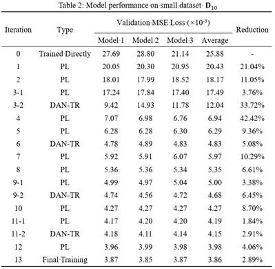 (1)初始小样本情况下,模型表现不佳,平均MSE Loss高达25.88×10-3;而采用本文的迭代自迁移方法后,验证集MSE Loss 下降85%(仅3.86×10-3),性能提升显著;