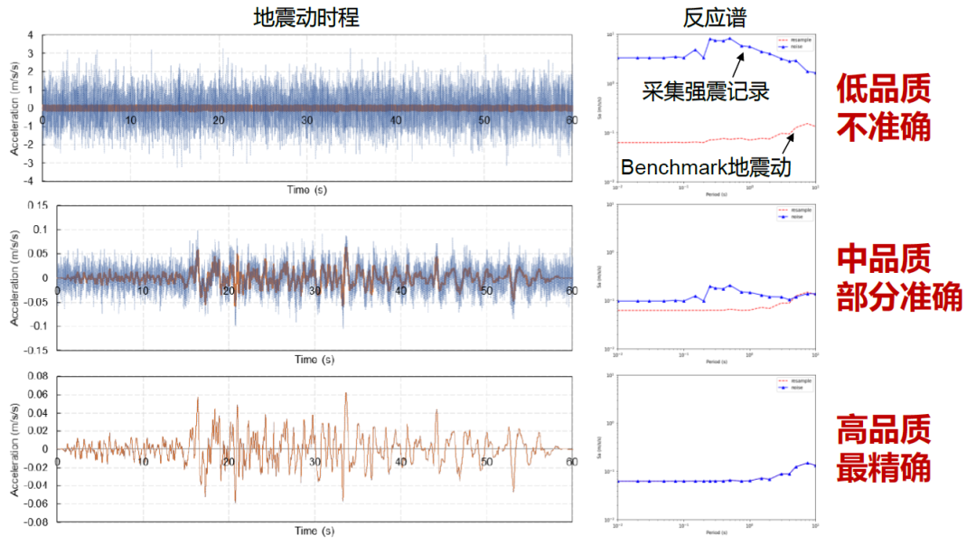 要获取不同质量的传感器在同一时间、同一地点采集到的同一条地震动,这个难度有亿点点大,所以我们优先采用传感器模拟和地震动模拟来开展本研究。传感器我们本次选用了三种,低品质、中品质、高品质加速度计(利益无关,也隐去传感器名称)。采用超算模拟的地震动时程场,即为Benchmark地震动(感谢文阳的地震动支持),采用MATLAB滤波函数进行传感器采集地震动模拟(感谢Farid的代码支持),然后再给地震动加上不同强度的高斯白噪声以简要的模拟不同传感器品质。