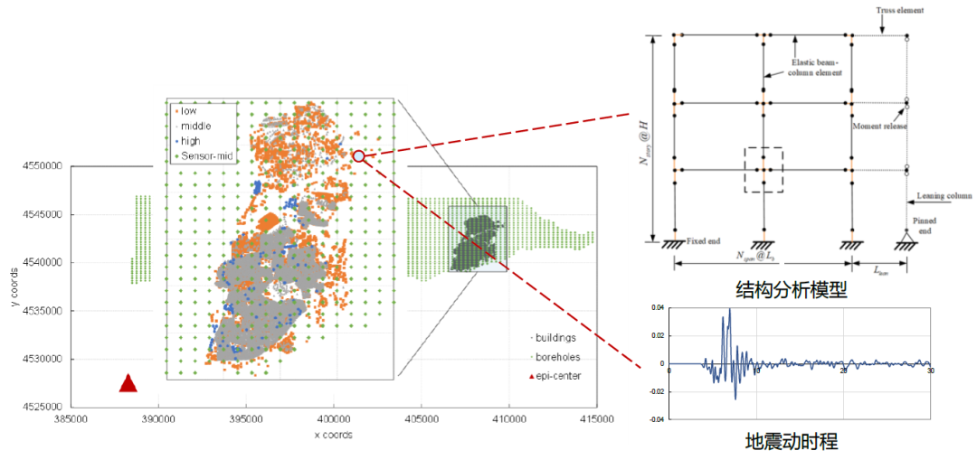 本研究采用了三步策略(当然不是打开冰箱门,把大象放进冰箱,关闭冰箱门这么简单的三个步骤)。首先是获得传感器采集的地震动记录,然后把不同传感器采集的地震动用于单体结构分析,再进一步应用于区域震害分析。