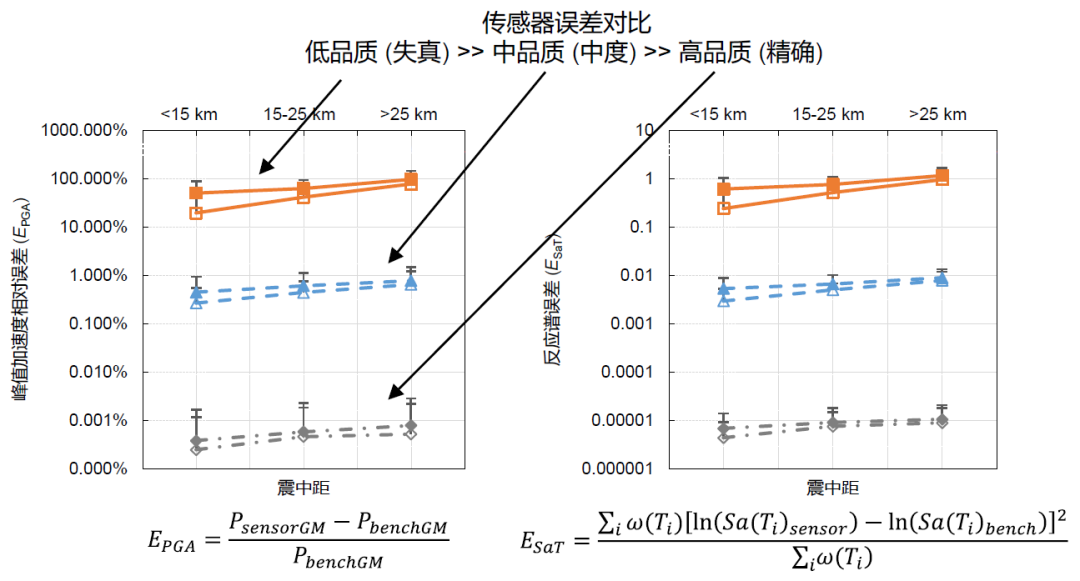 基于模拟地震动,对地震动场的所有振动进行了采集和误差分析,结论比较明显:随着震中距增加,误差逐渐增加;传感器误差对比:低品质(失真) >> 中品质(中度) >> 高品质(精确)。