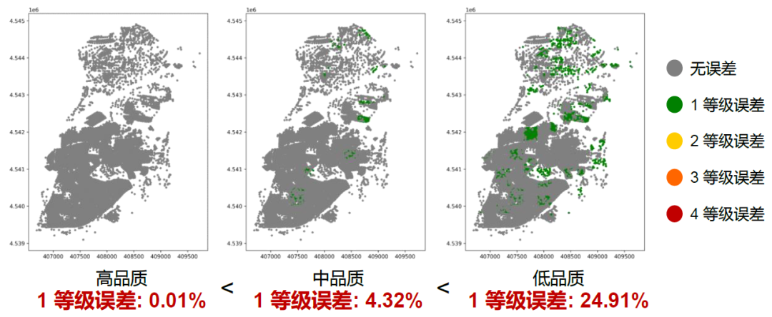 区域分析结果如下图,与精确分析结果对比后,可以看到低品质传感器地震动分析结果中,1等级误差达到了25%,中品质传感器则在4%,高品质传感器则仅0.1%。