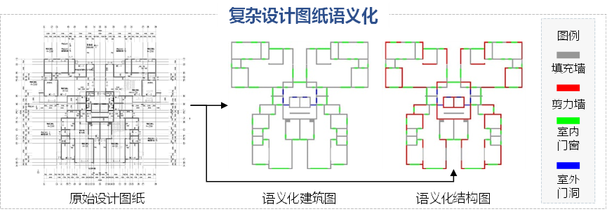 在5年前我们刚刚开始AI结构设计课题研究时,为了便于计算机学习设计图纸,我们将图纸中的不同信息通过不同颜色来表达,比如门标记为“蓝色”、窗标记为“绿色”、填充墙标记为“灰色”、剪力墙标记为“红色”(图2)。