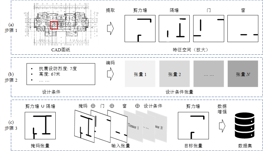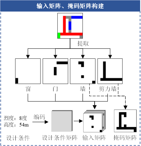 图4为本文提出的基于特征空间的图纸表征与增广方法,以实现对图纸和设计条件的有效表征。如图4(a)所示,该二阶张量用以表征建筑图中的某位置是否布置对应构件,若布置,则对应构件的二阶特征张量在该位置处的值为1(黑色),否则为0(白色)。同时,将有序且连续的设计条件,如高度等,归一化后复制扩维至与构件特征张量相同大小的条件张量;无序的离散设计条件,如材料类型、抗震设防烈度等,则映射为一个稀疏张量,复制扩维后得到与构件特征张量相同大小的条件张量,如图4(b)所示。