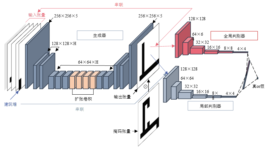 基于特征掩码的双判别器生成对抗网络架构如图5所示。本研究在GAN网络的基础上引入了两个基于卷积神经网络的全局判别器和局部判别器。全局判别器的输入如式4所述,除生成器的输出外串联了其他全部输入的约束,以从全局角度指导网络如何合理地布置剪力墙。局部判别器的输入如式5所述,除生成器的输出外仅串联了建筑墙的特征张量,以帮助生成器关注各个局部位置上剪力墙和建筑墙的相对位置关系。