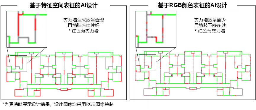 1) 相较于基于RGB特征空间,基于构件的特征空间图纸表征更有利于模型对剪力墙布置任务的学习,如图6所示;