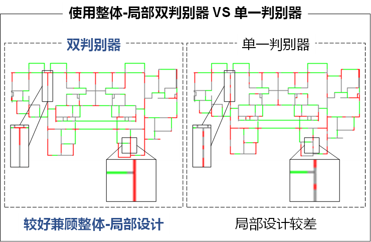 图8 使用双判别器与单一判别器的AI设计对比