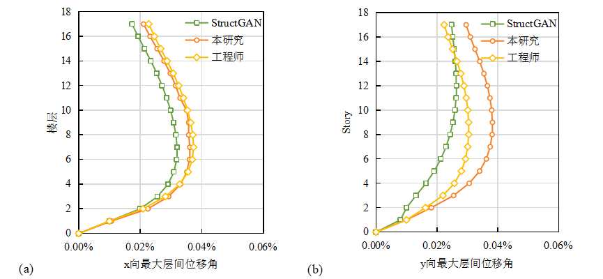 通过PKPM分析,得到设计的关键力学性能指标,分别如表2,图10所示。三者整体指标均符合要求,但相较于StructGAN,本研究模型生成的结构设计与工程师设计在绝大多数指标上的差异均显著减小,且在X和Y两个方向的结构刚度非常接近、层间变形基本一致。说明本研究数据表征和理解的优化方法可以使模型有效的捕捉训练集中隐含的工程师设计经验,从而使模型生成更符合实际经验和标准的剪力墙布置方案。