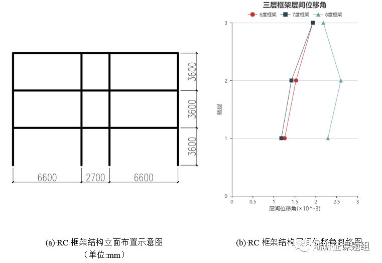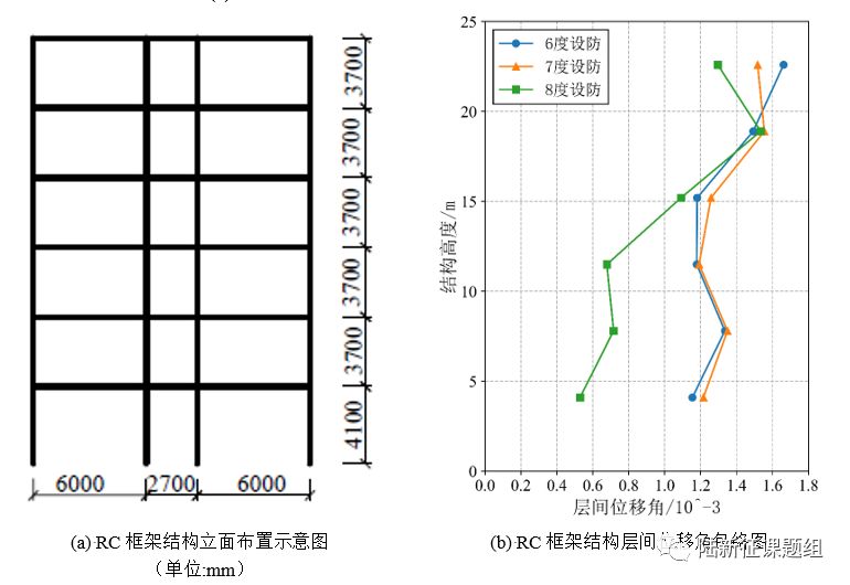 将推测地面运动记录输入立面布置如图5 (a)所示的6度、7度和8度设防的典型三层钢筋混凝土框架结构,得到其层间位移角包络如图5 (b)所示。
