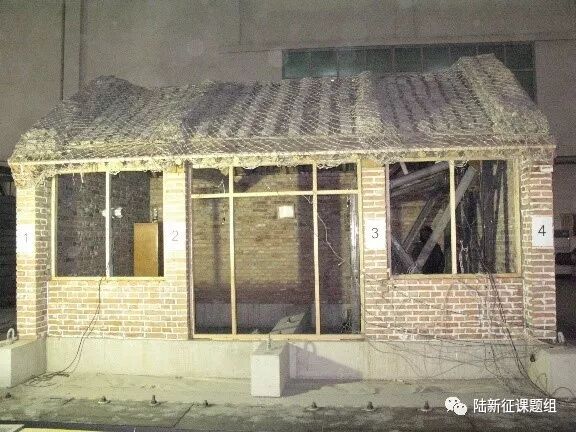 选取图6所示纪晓东等开展的单层未设防砌体结构振动台试验模型,输入推测地面运动,分析结果表明该结构将处于中度破坏状态。(纪晓东等,北京 市既有农村住宅砖木结构加固前后振动台试验研究,建筑结构学报,2012,11,53-61.)