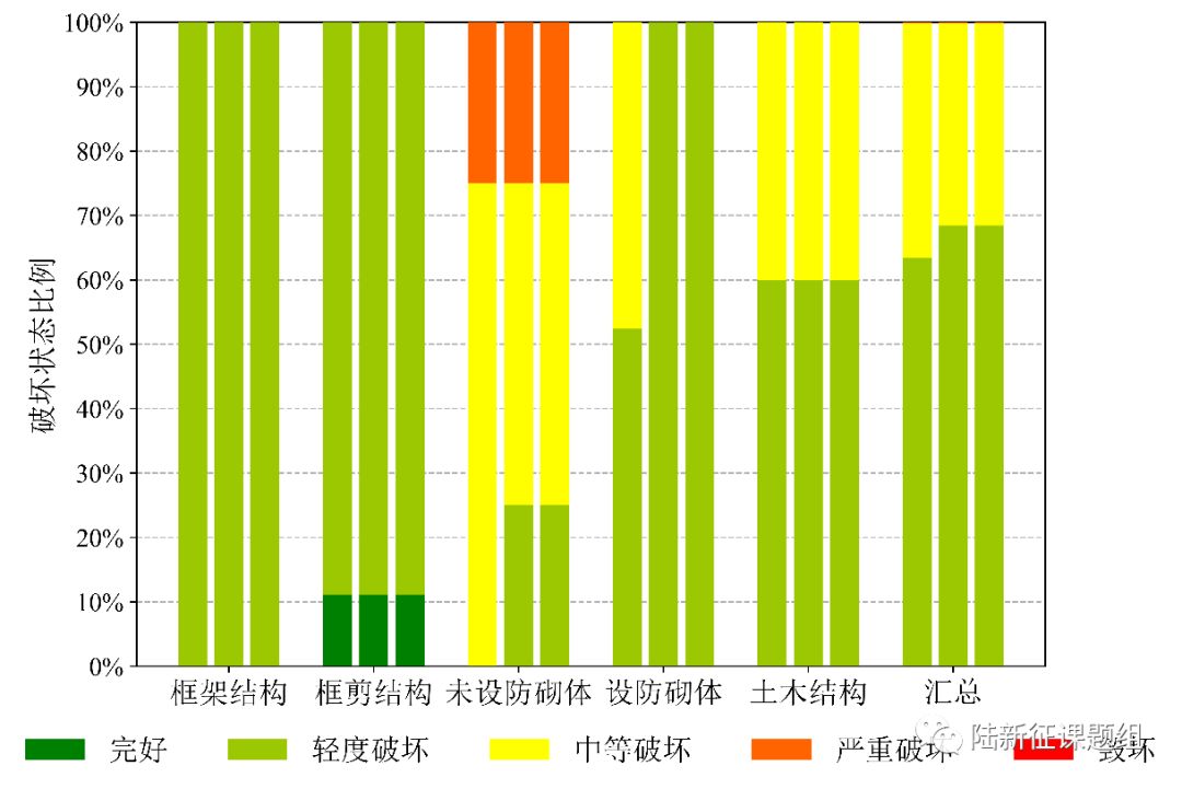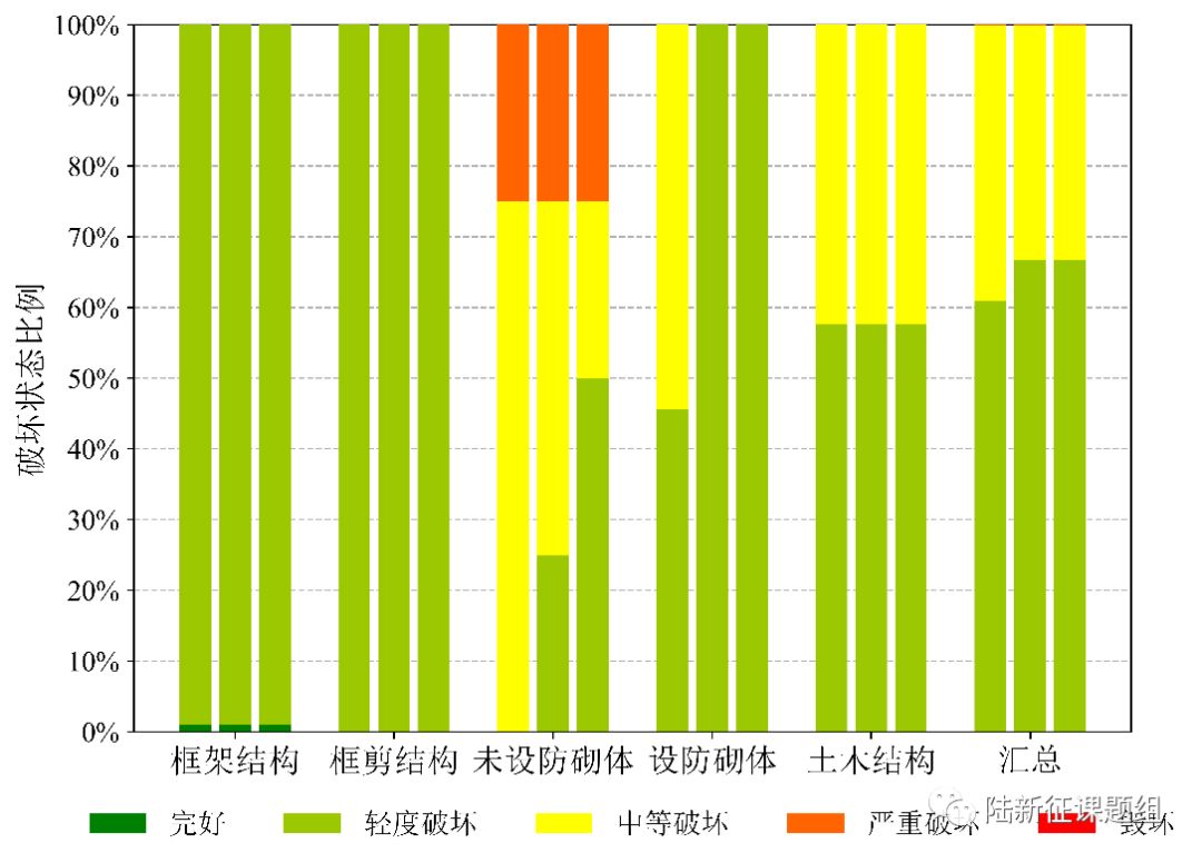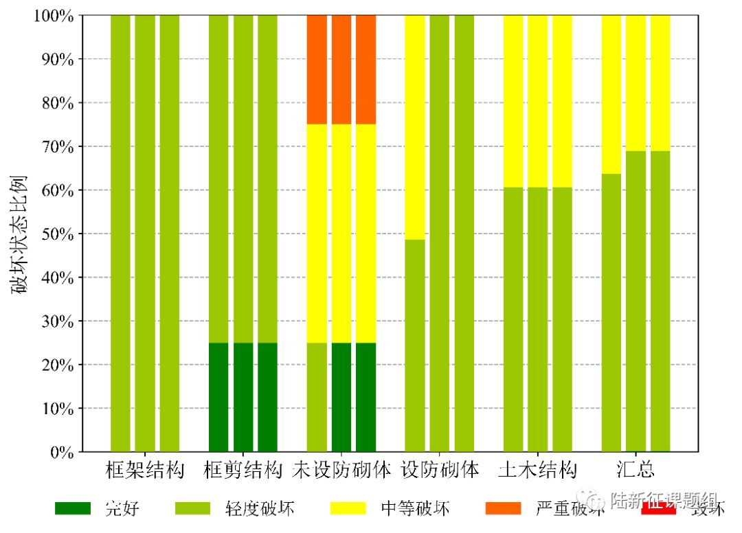 根据本课题组之前数据积累,将推测得到的地面运动分别输入云南普洱地区典型城市、乡镇和典型农村,得到考虑建筑承载力参数不确定性后的破坏状态如图11-图13所示。图中每类结构有三列,分别为结构抗力取中位值和加减一倍标准差的预测结果。(说明:由于每个结构的实际抗震能力都是有一定不确定性的,所以我们在新版的程序当中加入了对结构抗力不确定性的考虑)。