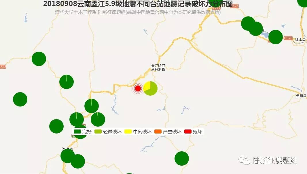 利用密布强震台网在震后获取的实时地震动信息,再结合城市抗震弹塑性分析,就可以得到地震发生后不同地点的建筑破坏情况,为抗震救灾决策提供科学支撑。图14为根据20180908云南普洱市墨江5.9级地震震中附近范围内台站记录分析得到的建筑震害分布示意图。震中附近结果为推测地面运动计算结果。在电脑上点击“阅读原文”或打开以下链接可以查看网页版地震力分布图。