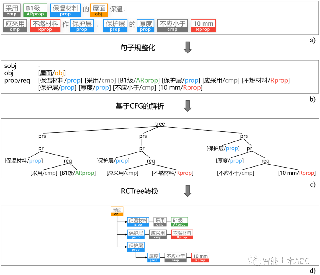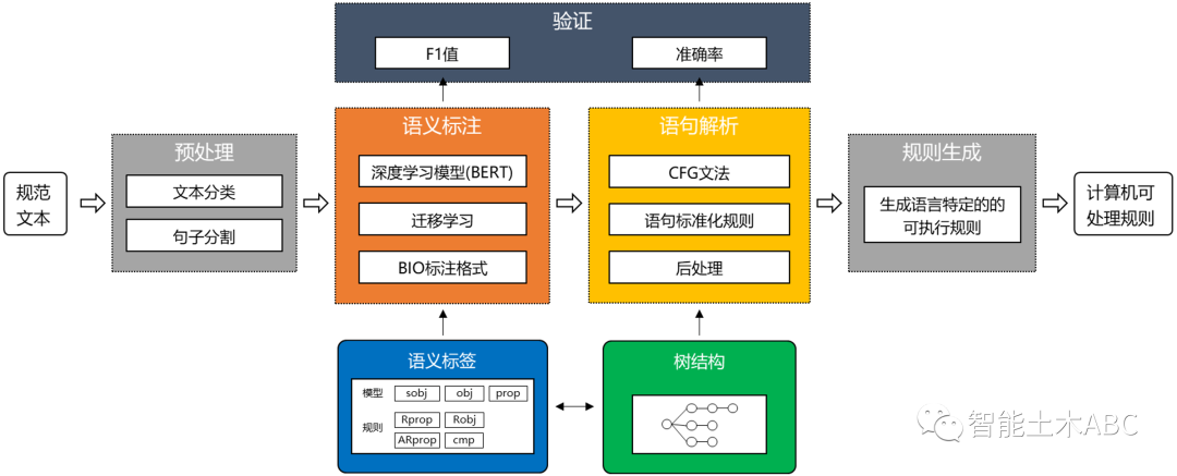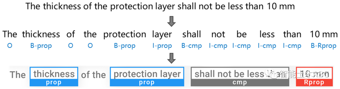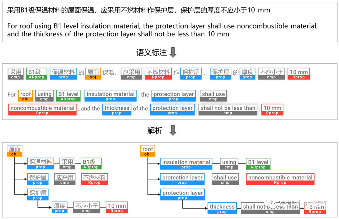 语义标注。此步骤给句子中的词或短语加上标签以表达语义信息,其中的语标签能够表示与BIM及规则相关的概念。标注方法为使用神经网络模型通过 BIO格式进行序列标记。语义标注结果可通过计算句子中每个标签的F1分数来验证。