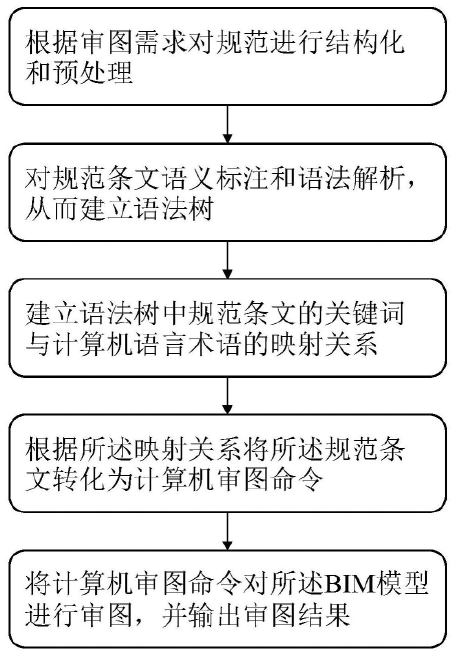 为实现上述目的,本发明采取以下技术方案:一种规范自动解译的BIM智能审图方法,包括:一、预处理:根据审图需求对规范进行结构化和预处理;二、结构解析:对规范条文语义标注和语法解析,从而建立语法树;三、规则生成:建立语法树中规范条文的关键词与计算机语言术语的映射关系;根据映射关系将规范条文转化为计算机审图命令;最后根据计算机审图命令对BIM模型进行审图,并输出审图结果。整体框架如图2所示。