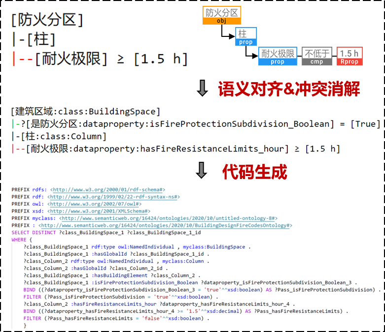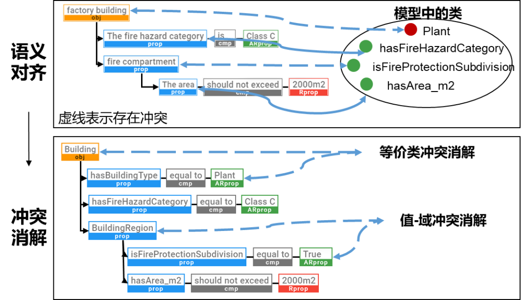 图3&图4展示了语义对齐及冲突消解的流程示例。具体而言,本实施例中采用维基百科中文语料和中文规范语料库训练词向量模型,从而计算文本表达的概念与本体概念的语义相似度,实现初步语义对齐。随后提出两类冲突消解方法,即域-值冲突消解方法和等价类冲突解决方法,根据土木工程领域知识修改语义对齐结果。在语义对齐和冲突解决之后是代码生成环节,本文采用一种基于领域关键词与规则的条文分类方法,以识别出适合不同条文的SPARQL函数;最后执行代码生成步骤以将语法树转换为计算机可处理的格式(本文以SPARQL为例)。
