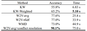 首先对不同语义对齐方法的性能进行评估,以准确率和运行时间作为评价指标,结果如表1所示。关键字匹配相关算法的准确率最低,KW为55.8%,KW-Weighted算法的准确率为65.2%。基于语义相似度匹配的方法(W2V-avg,WQ2V-tfidf,WMD)的准确率高于基于关键字匹配的算法。所提出的语义相似度和冲突消解算法(W2V-avg+conflict resolution)达到了90.1%的最佳准确率。
