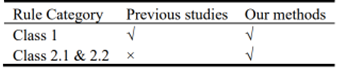 表2显示了本文的方法和以前的方法可以自动解译的规则类别。由于SPARQL语言提供了预定义的函数,这些函数更适合简洁地表示具有隐含属性(如数量、派生属性)的审图规则。因此,本文提出的方法可以解译2.1和2.2类的规则。